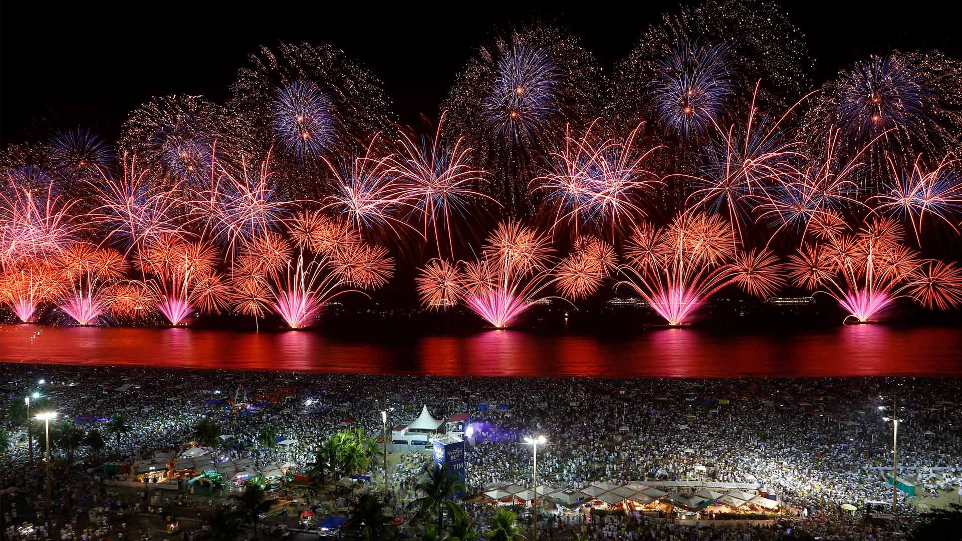 New Year's Eve fireworks over Copacabana Beach, Rio de Janeiro, 巴西 (© Wagner Meier/盖蒂图片社)